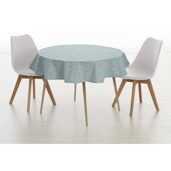 Mantel redondo confeccionado antimanchas, con dos capas de resina y una de teflón, lo que le aporta un tacto plastificado, pero no hace que el mantel se quede completamente rijido. Al ser un mantel impermeable puede ser usado también para exterior.