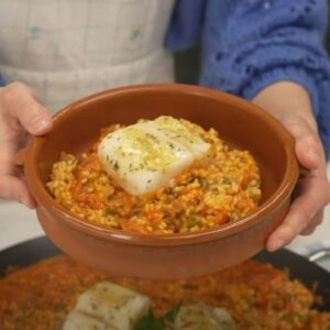 El bacalao se cocina a fuego lento en aceite para que quede tierno, jugoso y con todo su sabor. El arroz, por su parte, se impregna del sofrito y de un caldo sabroso, soltando su almidón poco a poco hasta alcanzar esa textura perfecta, entre caldoso y seco.